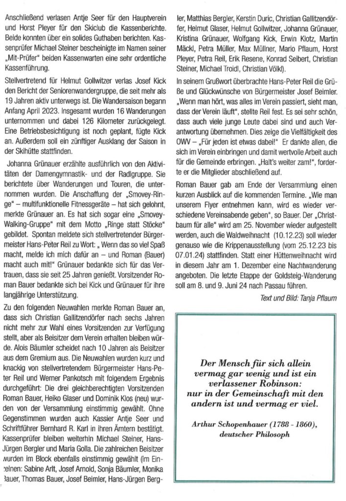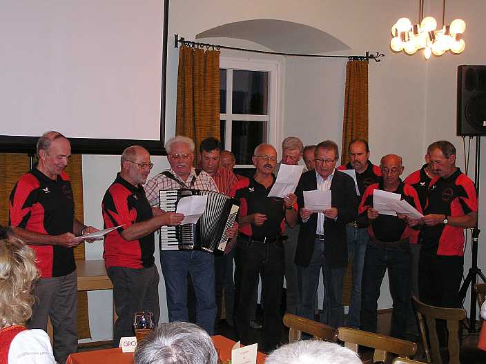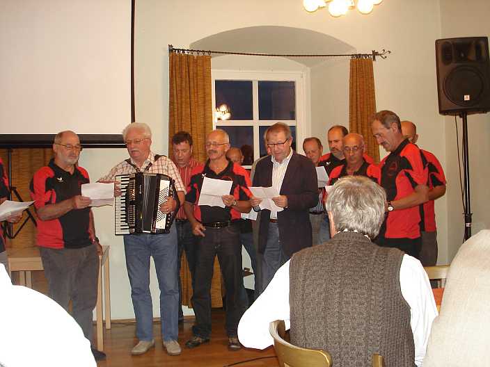 Ganz leise und ruhig war es im Publikum, als die Gruppe „Hackbrett Furiosa“ mit Christine Eller, Martin und Andrea Zellner mit Hackbrett und Akkordeon zum Einsatz kamen. Begeistern konnte auch die Formation „Triangel“ mit den Sängerinnen Andrea Götz, Steffi Daubenmerkel und Doris Völkl, die den „Postfrosch“ und weitere Titel forsch aber auch gefühlvoll zum Besten gaben. Manuela Grünauer begleitete gekonnt auf der Gitarre. Muksmäuschen still war es, als das Ave Maria, das Lieblingslied des kürzlich verstorbenen OWV-Mitgliedes Alfred Troidl, von seinen Neffen Andreas und Michael Troidl, sowie Sepp Pflaum mit seinen Söhnen Johannes und Josef gesungen wurde. Zwischendurch verstand es Horst Pleyer mit lustigen Geschichten die Anwesenden zu begeistern.