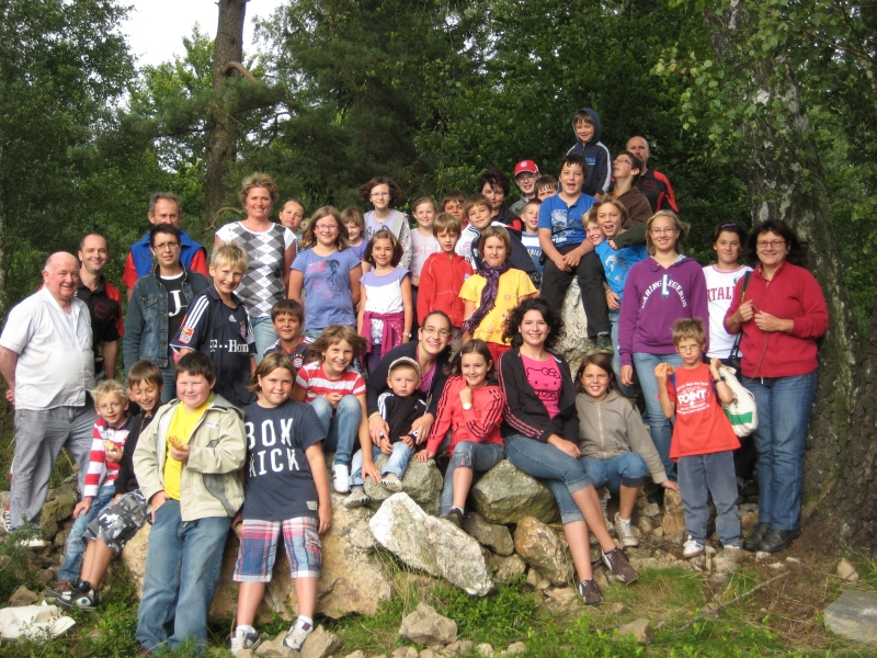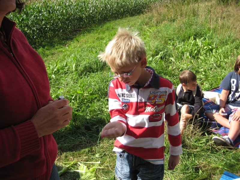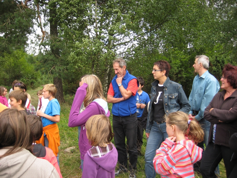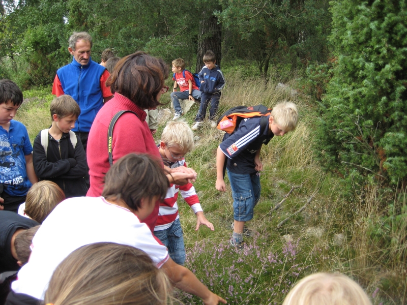 35 Kinder und erwachsene Vereinsmitglieder als Betreuer machten sich mit dem Bus auf den Weg zur Wacholderheide, einer ehemaligen Weidefläche bei Wampenhof. Dort wurden sie von Frau Müllner, Landschaftspflegerin des Naturparks Oberpfälzer Wald, empfangen. Die Naturexpertin, die durch diesen Nachmittag führte, erklärte zunächst den Leitsatz. Arkadien ist ein aus der Antike bekanntes abgeschlossenes Berg- und Hochland, dessen Menschen unbelastet von mühsamer Arbeit und gesellschaftlichem Anpassungsdruck in einer idyllischen Natur als zufriedene und glückliche Hirten leben konnten. Vielen Menschen ist Arkadien einfach der Inbegriff einer romantischen Landschaft. Durch dieses „Arkadien“ durften die Kinder anschließend streifen und machten dabei viele Entdeckungen, angefangen bei unterschiedlichsten Insekten, einer Wespenspinne mit Kokon, einer Vogelrupfung bis zu einer lebenden sowie toten Blindschleiche. Manche der jungen Teilnehmer pflückten Adlerfarn, Heidekraut und verschiedene andere Pflanzen.