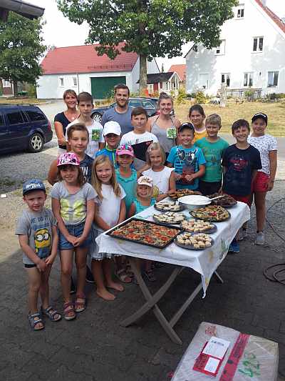 Einen Volltreffer landete der OWV Waldthurn beim diesjährigen Ferienprogramm. 20 Kinder trafen sich mit dem Fahrrad beim Sportplatz zur gemeinsamen Fahrt nach Altenstadt bei Vohenstrauß. Bei halber Strecke hatte Sabine Arlt eine Verpflegungsstation aufgebaut. Nach einer angemessenen Rast und gestärkt mit Getränken und Süßigkeiten ging es weiter zur Wildkräuter-Führerin Sandra Stengel-Rewitzer, welche bereits umfangreiche Vorbereitungen getroffen hatte. Die selbst hergestellte Kräuterlimonade mundete nicht nur den anwesenden Kindern, sondern auch den Begleitpersonen Johanna Grünauer, Sonja Bäumler, Petra Müller, Nadine Grünauer, Monika Bauer, Hans-Jürgen Bergler, Simon und Roman Bauer. Nach kurzen Erläuterungen und einer paarweisen Aufteilung ging es ans Sammeln von heimischen Kräutern und Pflanzen. „Alles was bei mir im Garten und auf dem Feld gefunden wird, könnt ihr beruhigt essen“, ergänzte die Gastgeberin. Mit großem Eifer machten sich sodann die Pärchen auf den Weg und fanden Spitzwegerich, Klee, Brennnessel, Schafgarbe, Salbei, Lavendel, Vogelmiere, Beinwell und vieles mehr. Die selbst gepflückten Brennnesselblätter wurden sodann im Pfannkuchenteig gewendet und in einer Pfanne am offenen Feuer gebraten und verzehrt. Die eigenhändig zubereitete Wildkräuter- und Rosenblütenbutter, aufgestrichen auf frisches Bauernbrot, schmeckte fantastisch, genauso wie der Kräuterquark und die Wildkräuterpizza. Das Stockbrot am offenen Lagerfeuer war ebenso eine Attraktion wie die Gummibärchen aus Holunderbeeren. Als krönenden Abschluss gab es noch Himbeereis aus Rotkleeblüten. Ein Fläschchen mit Sonnenblumenöl und Spitzwegerich, natürlich eigenhändig produziert, durften alle Kinder mit nach Hause nehmen. Diese Mischung hilft gegen Husten und Insektenstiche. Voller Begeisterung und mit sehr guten Eindrücken ging es am späten Nachmittag wieder mit dem Fahrrad durch den idyllischen Schwarzenbach zurück nach Waldthurn.