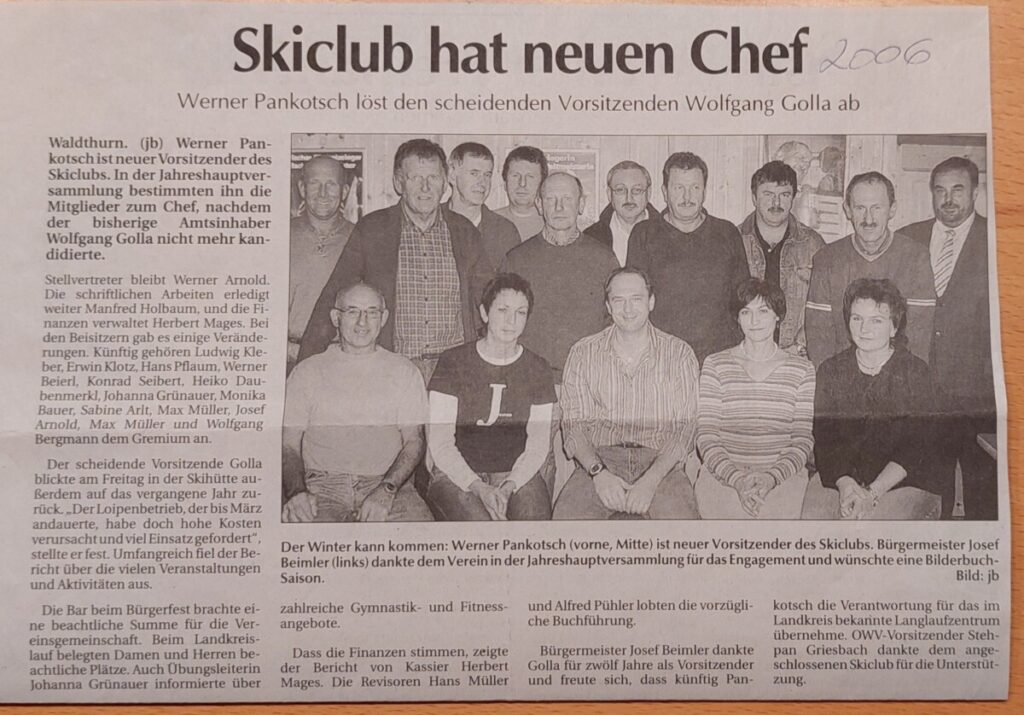 Weiterhin wird Werner Pankotsch die „Skiclubfamilie“ führen, Wolfgang Bergmann und Josef Arnold sind seine Stellvertreter. Die schriftlichen Arbeiten erledigt Manfred Holbaum und Herbert Mages wird auch in Zukunft ein wachsames Auge auf die Finanzen werfen. Als Beisitzer wurden gewählt: Sabine Arlt, Monika Bauer, Johanna Grünauer, Stefan Grünauer, Hans-Jürgen Bergler, Christian Steiner, Erwin Klotz, Hans Pflaum, Werner Beierl, Konrad Seibert und Max Müllner. Christian Völkl kümmert sich um die neue Pistenraupe als Maschinenwart. Die Kasse wird auch weiterhin Michael Steiner und Alfred Pühler überwachen und prüfen.