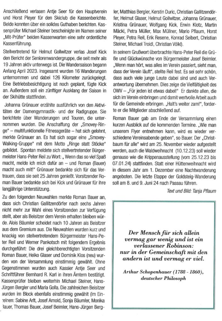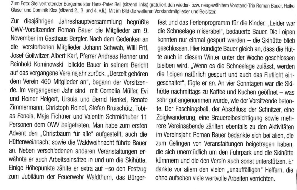 Für den am OWV angeschlossenen Skiclub trug Werner Pankotsch die Jahresaktivitäten vor. Bürgermeister Josef Beimler meinte, der OWV habe die Aufgabe, das Bewusstsein für die Heimat zu stärken. „Ihr tut mehr als eure Pflicht“.