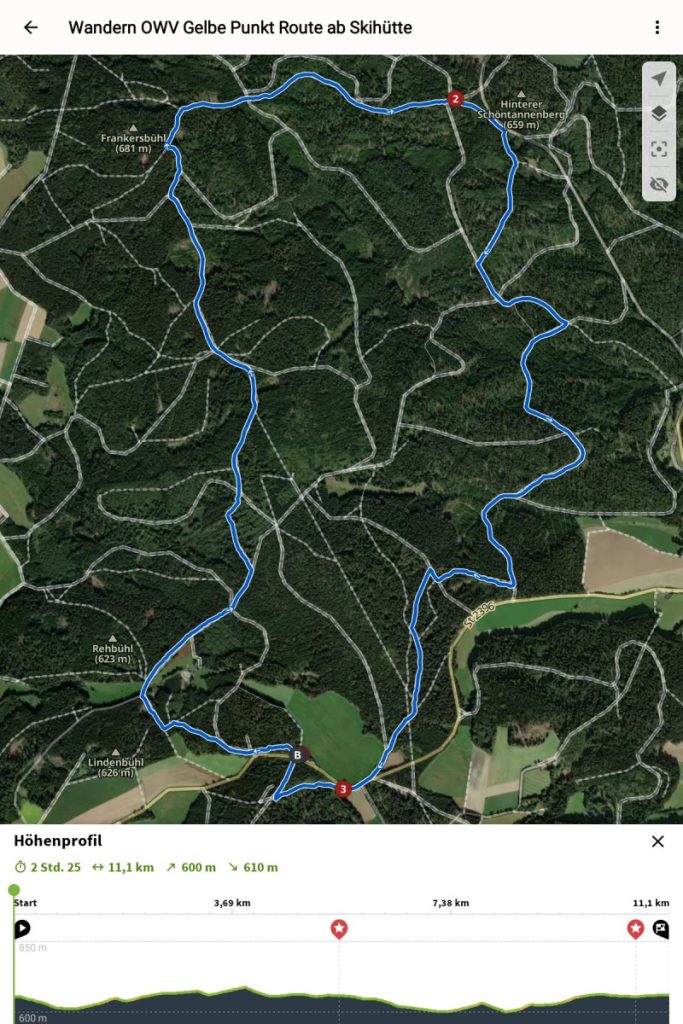 Ausgangspunkt dieses Wanderweges ist die Skihütte des OWV Waldthurn mit Parkplatz an der Straße nach Neuenhammer. Dieses Wandergebiet – im Winter bei guten Schneeverhältnissen ein Eldorado für Langlauffans aus nah und fern – befindet sich in einem großen, zusammenhängenden Waldgebiet in den Waldabteilungen Eisschellen, Spielberger Wald, Onigl und Schöntannenberg. Von hier aus sollen ja hin und wieder die Glocken einer versunkenen Stadt läuten. Dieser Wanderweg ist aufgrund leichter Steigungen, Absstiege und ebene Abschnitte sehr abwechslungsreich. Im Sommer bei sonnigen Temperaturen aber gut zu begehen, da sich der umgebende Wald als angenehmer Schattenspender erweist.